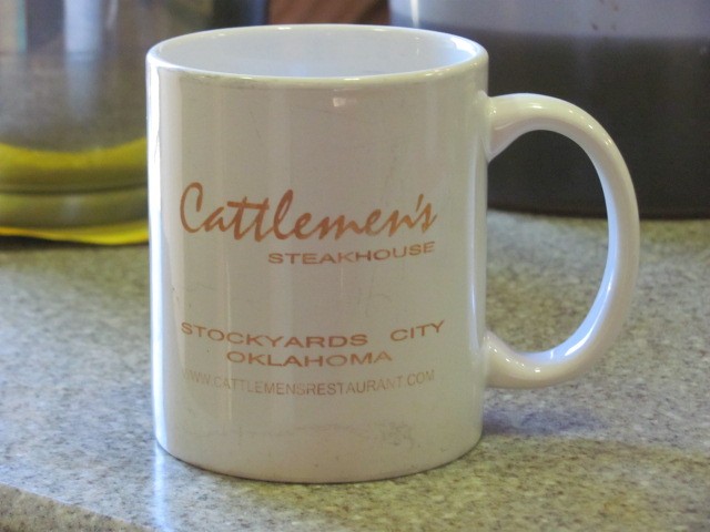 we are due to leave in a few minutes to begin a 2 day drive from our home in NC to our son's home in St Louis .... figured it would be appropriate this morning for coffee in our Cattlemen's Steakhouse in OK, City ---- http://www.cattlemensrestaurant.com/ ---- if you are in OK City and want a good steak with a side of frontier history, you would be well served to consider Cattlesmen's