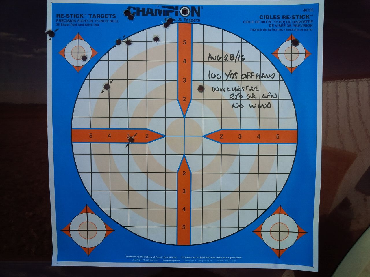 Shot the rest at 100 yds off hand standing. Set sight to top notch but shot high. Last time I shot 100 yds it was breezy but no drop at all today it seemed. Range all to myself again.