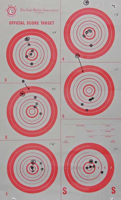 the "S" is group #6. What I normally do is fire 6 rds. with each load I'm trying out that day. The first shot is one one circled. I do this because I've found with many guns as you change the powder charge the first shot doesn't go into the group. As you can see by the target this is pretty obvious. :) I think I know the reason for the great variations but I'll get into that later.