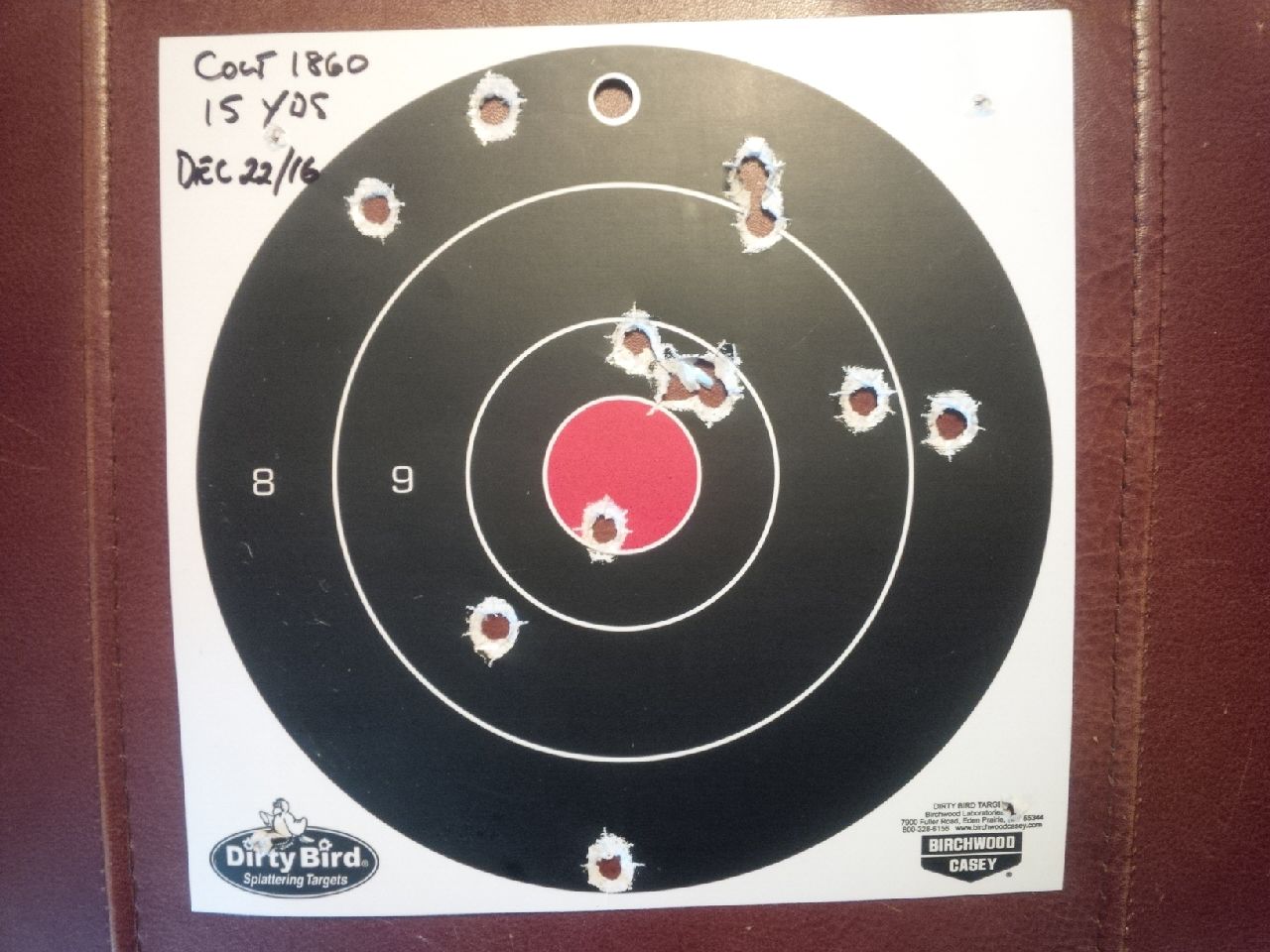 The other target is the 1860 Colt cartridge conversion, 8" barrel, open top and 45 Colt as well. I shot from 15 yds, one hand and standing. It was 15 rounds but looks like a couple went into the wood and not on paper. The issue I had today was steadying my arm in the wind. Shot American Eagle 255 gr JSP.