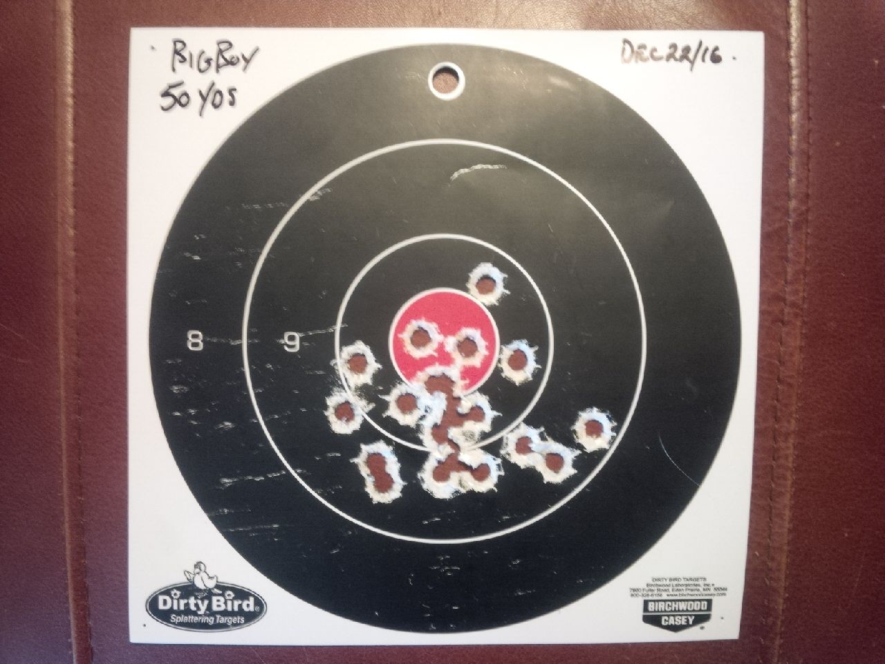 Those are 8" targets. 50 yds is about the max distance that I can see them hit. I tried at 100 yds one time, but it's a crap shoot whether you got on the paper or not until you walk out there. Usually as long, sad walk back.