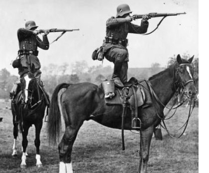 Both are of calvary soldiers getting in some of their rifle training. I could easily see one foot resting in a stirrup, but both feet on the saddle? Whoa!