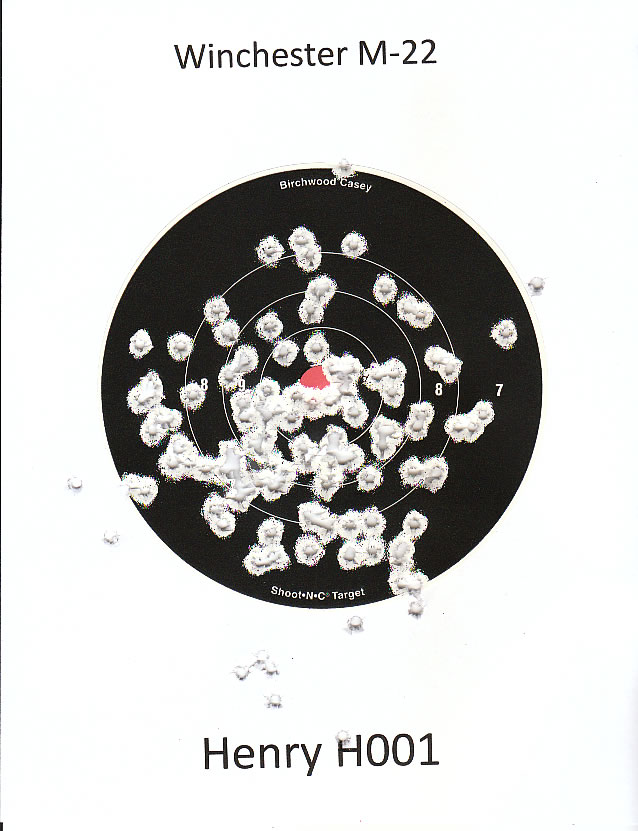 I took my long neglected Henry H001 and Heritage Rough Rider Revolver to the range today. I shot 120 (full speed loader) rounds in the Henry and 100 rounds in the HRR. I only used one target for each gun and I always shoot off hand. I shot the Henry at 75 feet using a 4x Simmons scope and the HRR at 25 feet. I have to say that even though the targets aren't great and I still have lots of practice ahead of me, I had a great time with both guns. I think it's time to bend the front sight on the HRR a bit, though. I've never changed it and it looks pretty obvious that it shoots to the left.