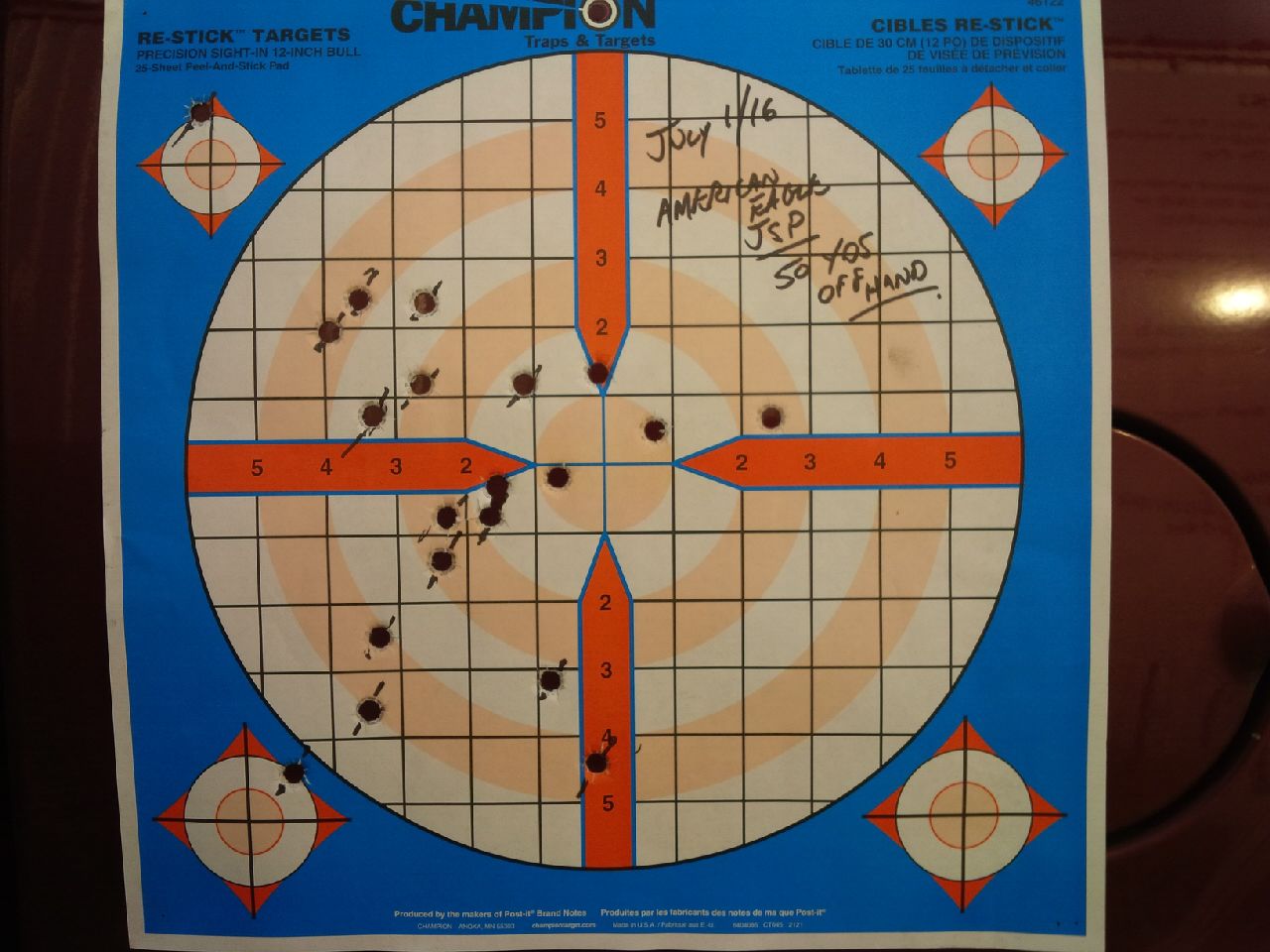 Finally got to the range! Very windy again. 50mph cross wind. You can see the effect on the 50 yd target. Too many to the left. Shot a combo of Hornady and American Eagle. For the hell of it I put last 5 rounds on 100 yd target. All shots off hand standing with factory sights of course. Fun night!